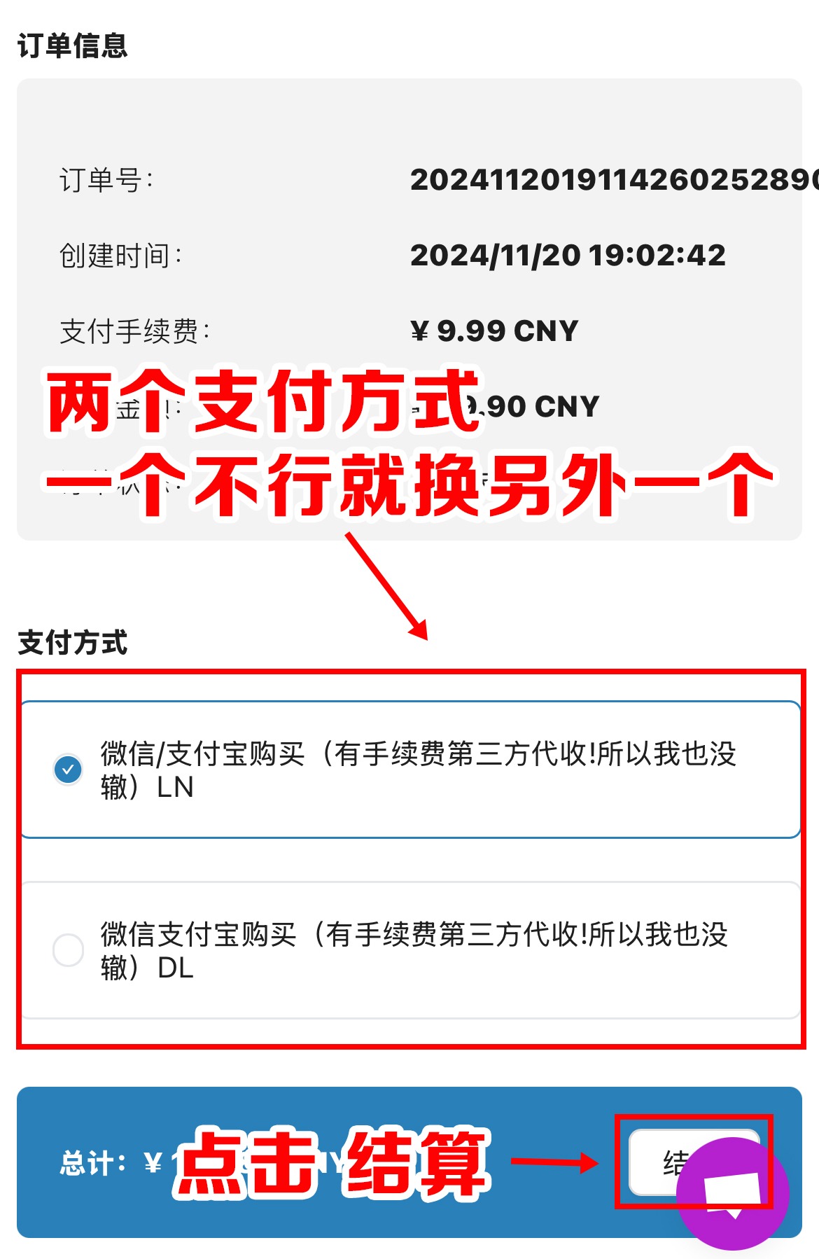 8.跳转后有两个支付方式,若一个支付方式无法结算,那么就换另外一个支付方式尝试。若都无法结算,那么建议换个浏览器再次尝试!