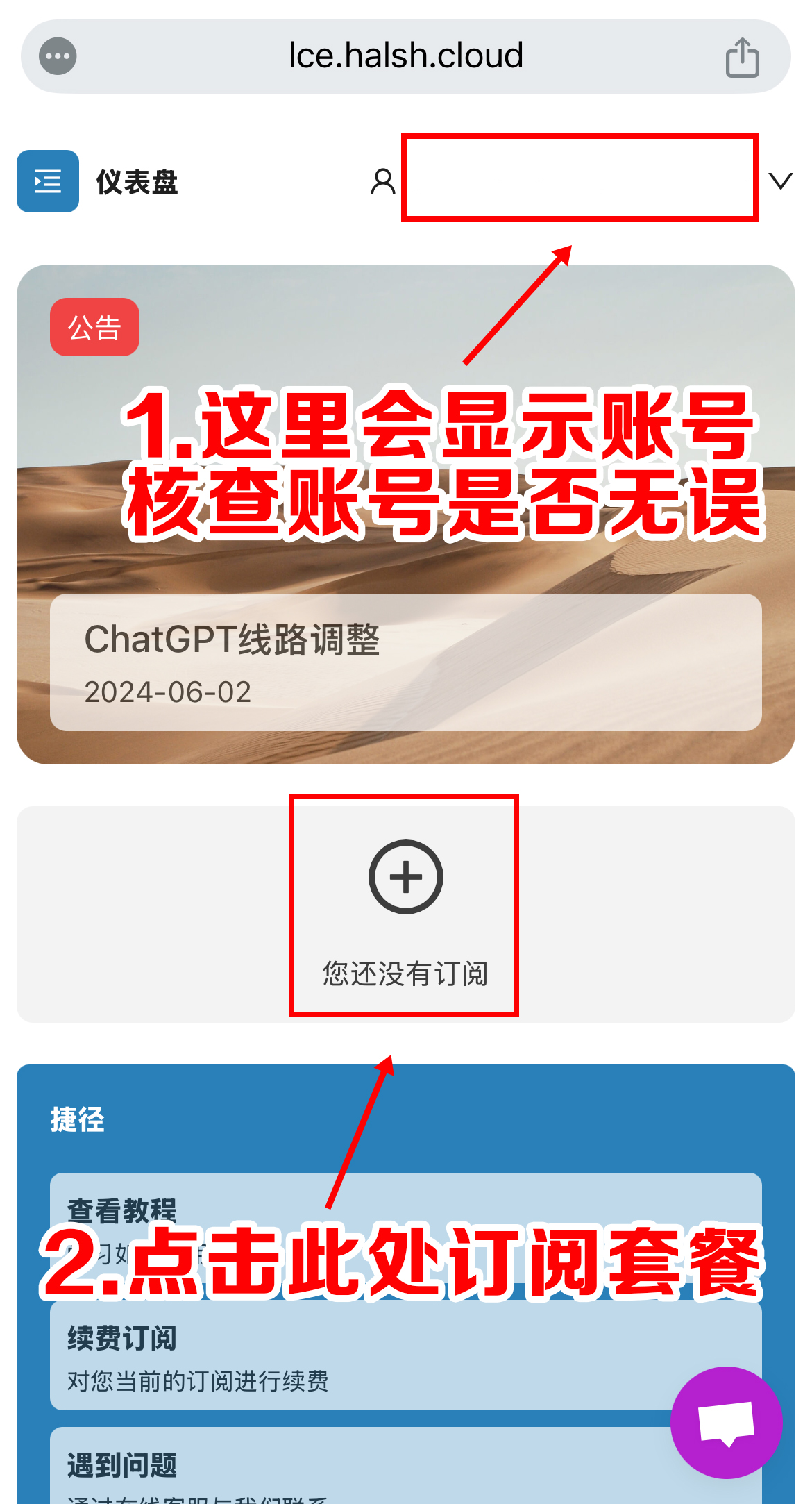 注意:若购买套餐后官网未显示、未到账请看如下操作