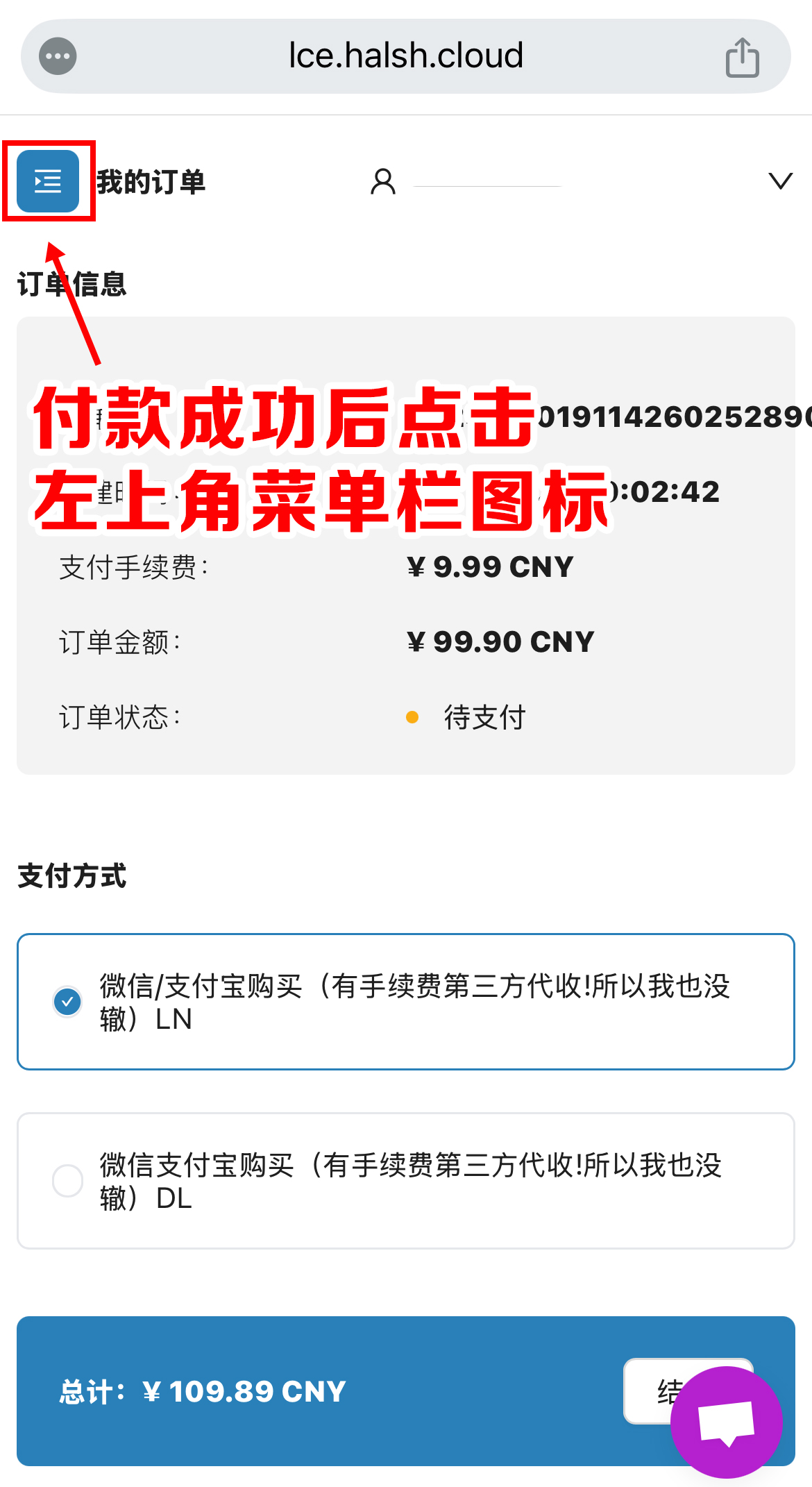 9.注意:支付成功后,页面是不会主动跳转的,需要回到官网手动点击左上角菜单栏!